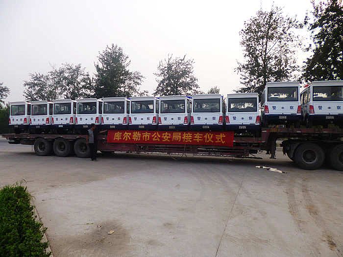 2013年7月18日 新疆库尔勒市公安局订购的十一辆电动巡逻车正式下线,整装发往新疆。此次采购的是封闭式电动巡逻车,十分适合在新疆当地巡逻使用。 十一辆电动巡逻车装车完毕,发往库尔勒市