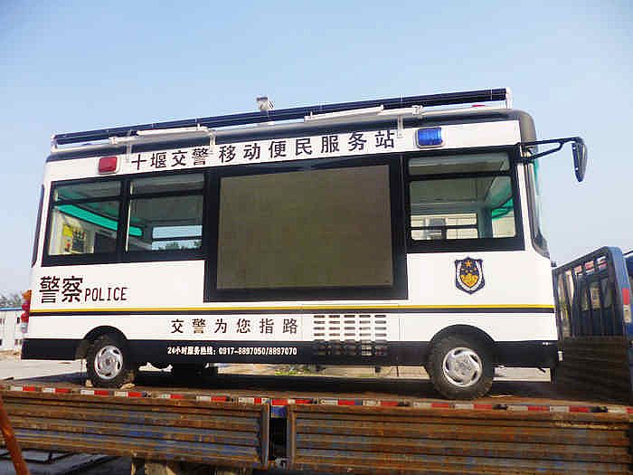 湖北十堰交警从我公司定做一辆移动便民警务室,此警务室与其他警务室相比,最大特点是 车身有一块巨大的LED显示屏,可以清晰的显示当地实时的交通状况,交警提示等信息,大大方便了广大车主出行。 移动便民警务室发车仪式