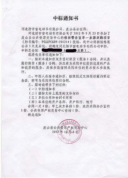 广东沐鸣2电动车公司新疆皮山县中标通知书